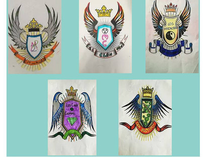 En la primera fotografia podem veure dibuixos que representen l'escut d'alguns clans. En la segona, exemples de cartes que els alumnes podien utilitzar en diferents ocasions.